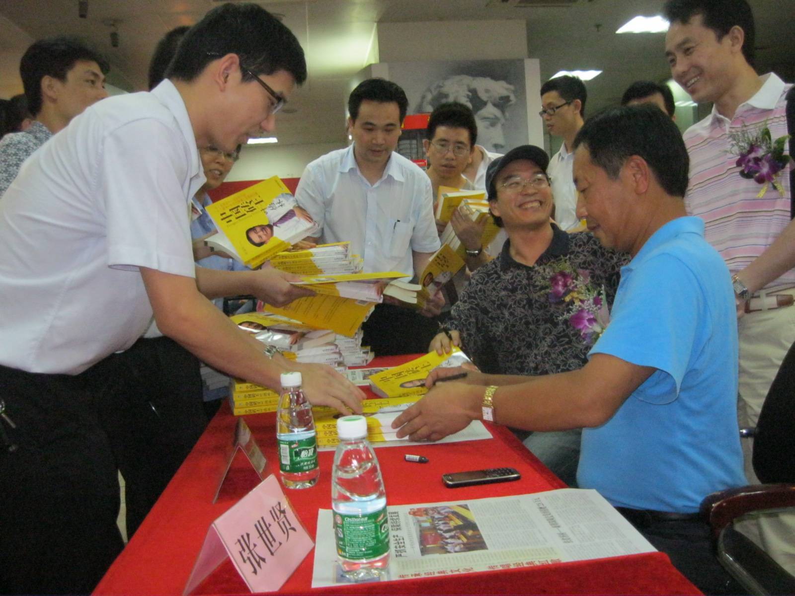 签售仪式现场,《中国砖王叶德林》作者黄康俊、该书传主叶德林、经济管理出版社社长张世贤等并排而坐,被众多书店顾客和媒体围堵。短短一个多小时,《中国砖王叶德林》就签售了数百本。